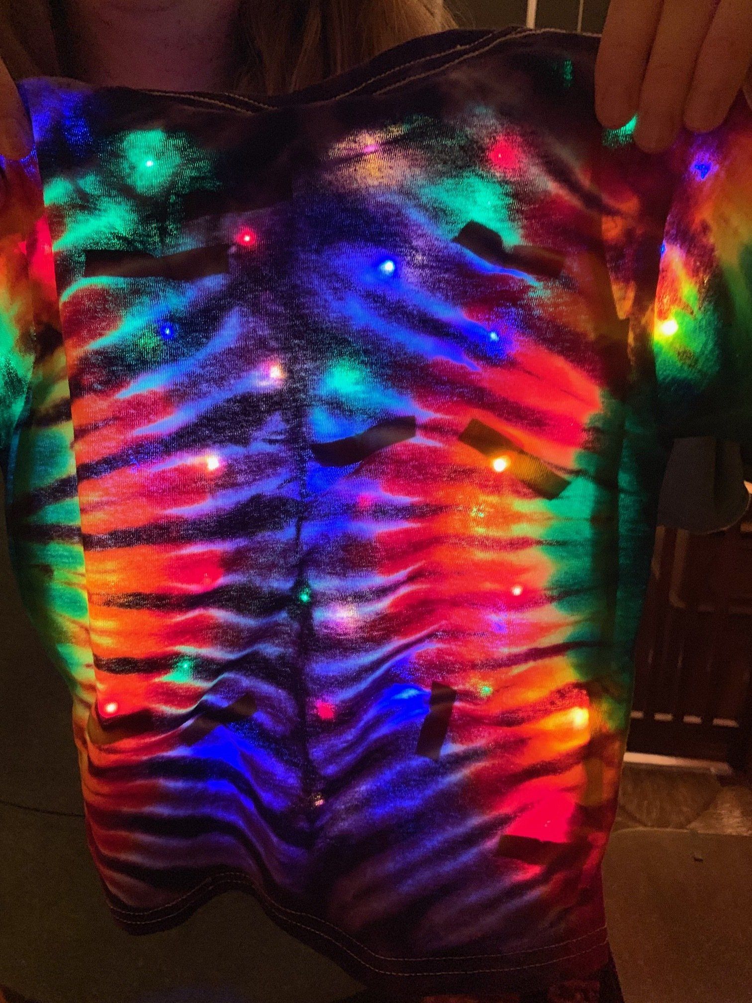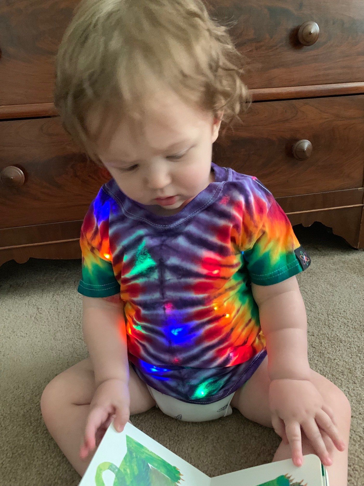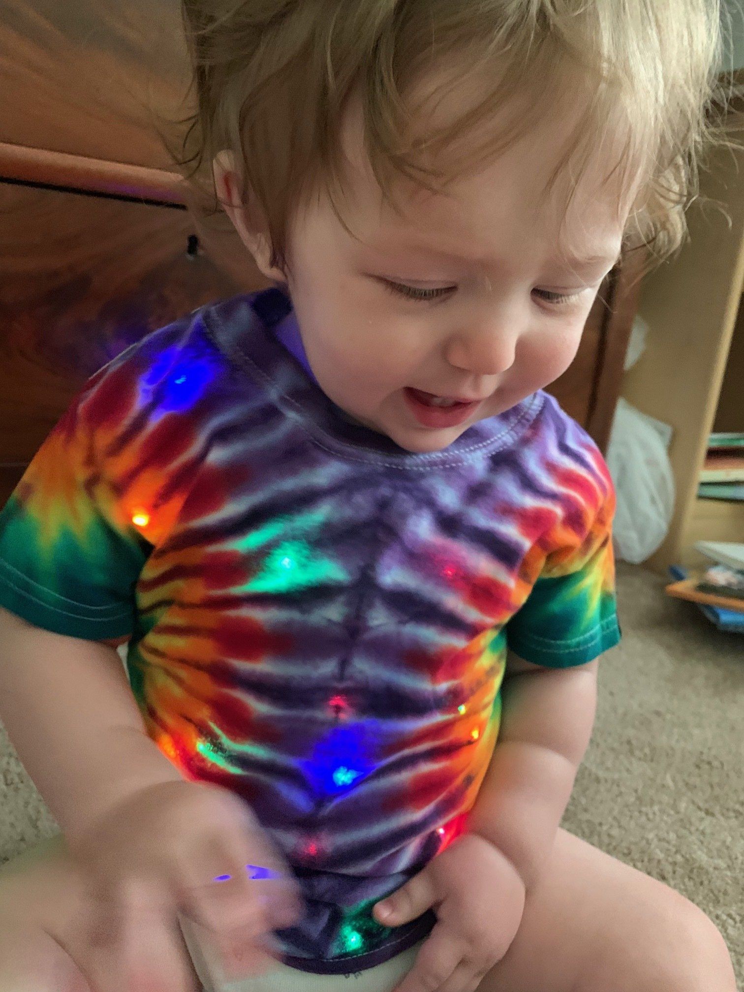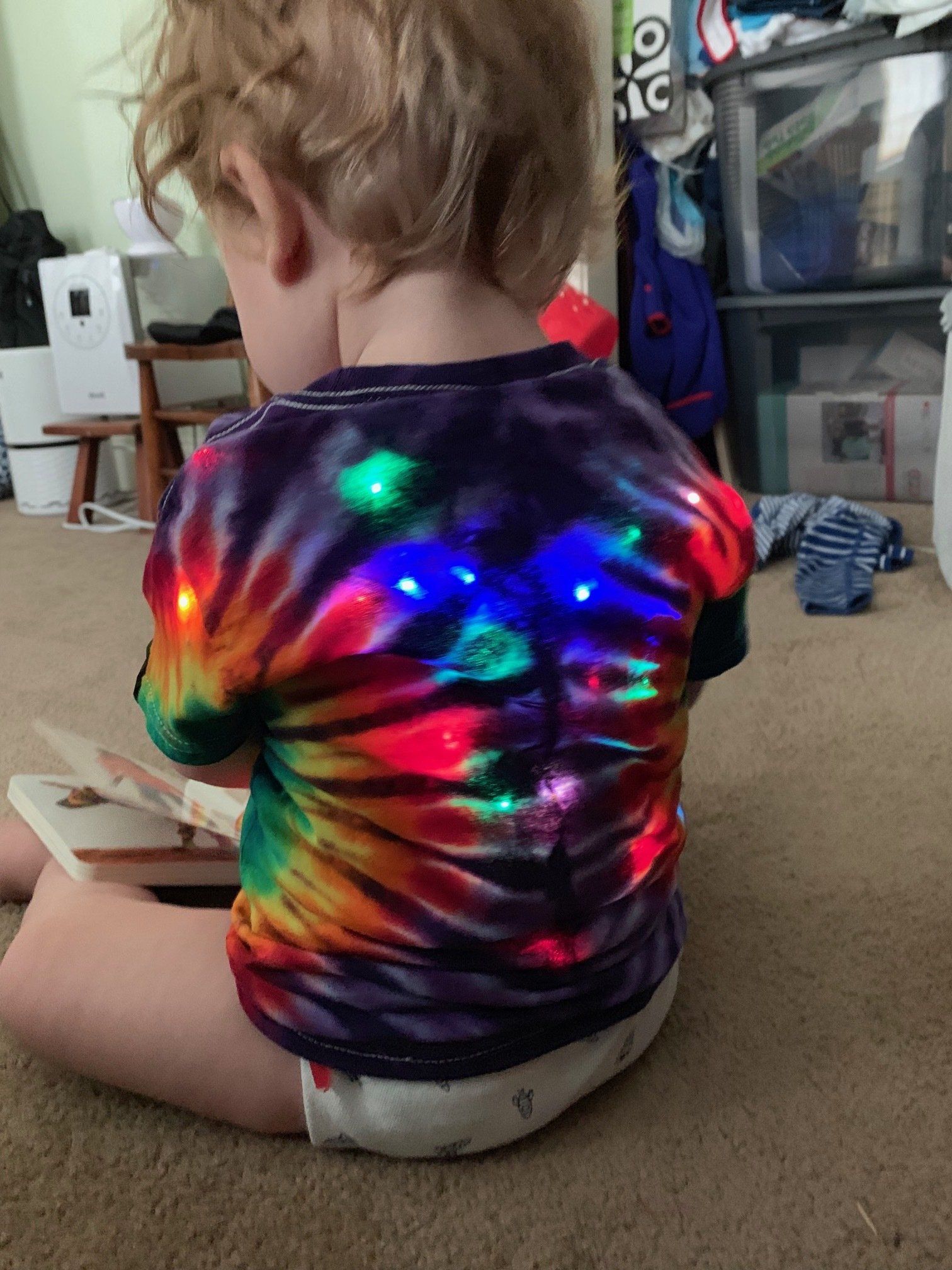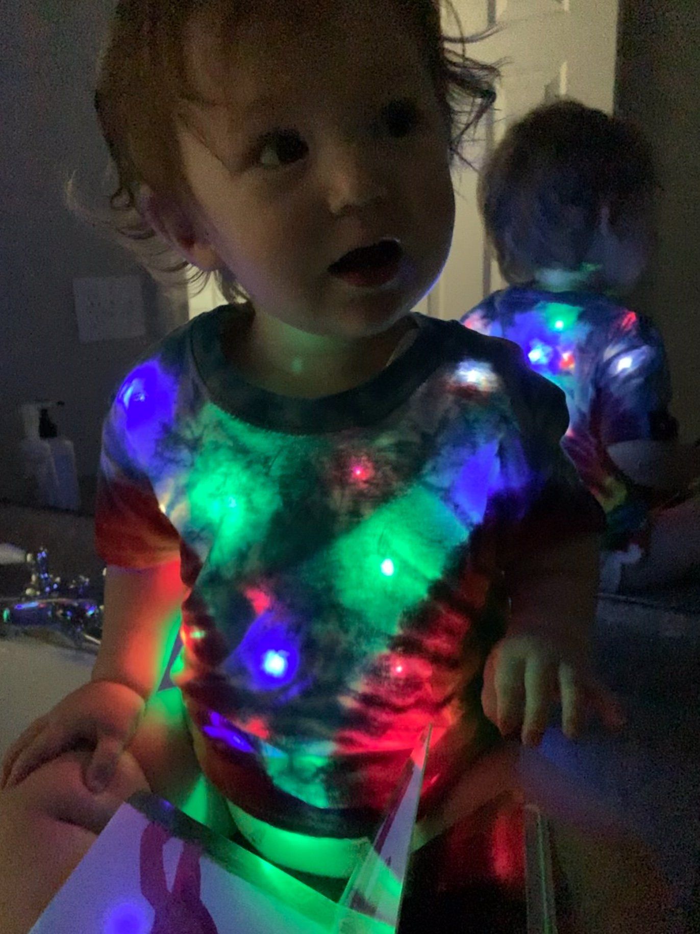Taking partywear to the next level. Inspired by a love for all things lighting, color and art. Invented to see children at night in a crowd.